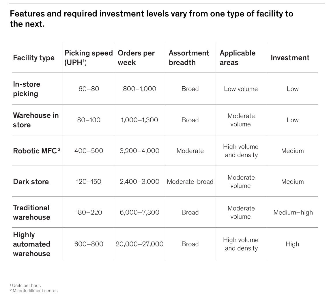 Grocers can take advantage of a range of picking options with different degrees of centralization, capacity, and automation. Grocers need to build a portfolio of fulfillment options by geography, with the mix varying by the density of current and projected demand and their fundamental online value proposition (for example, cost or speed of delivery).”