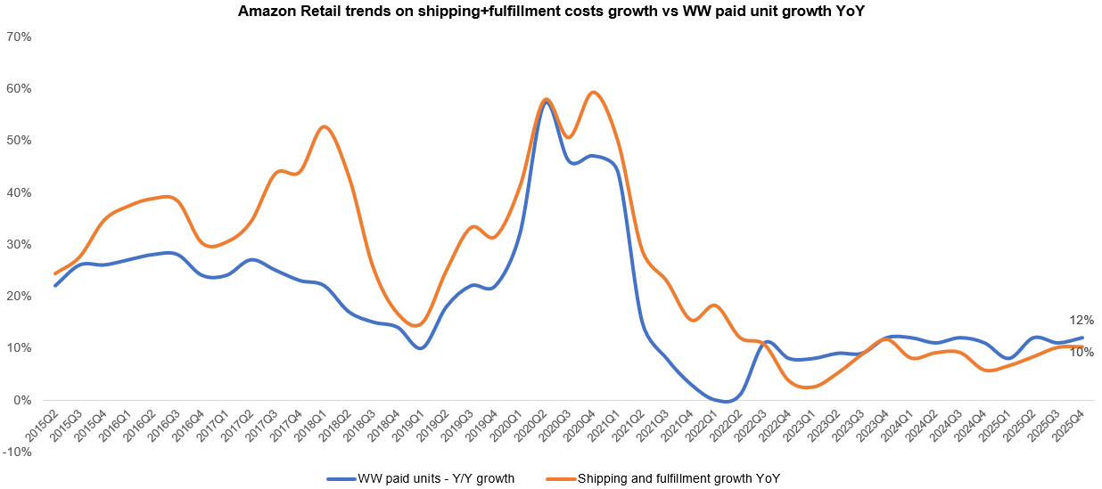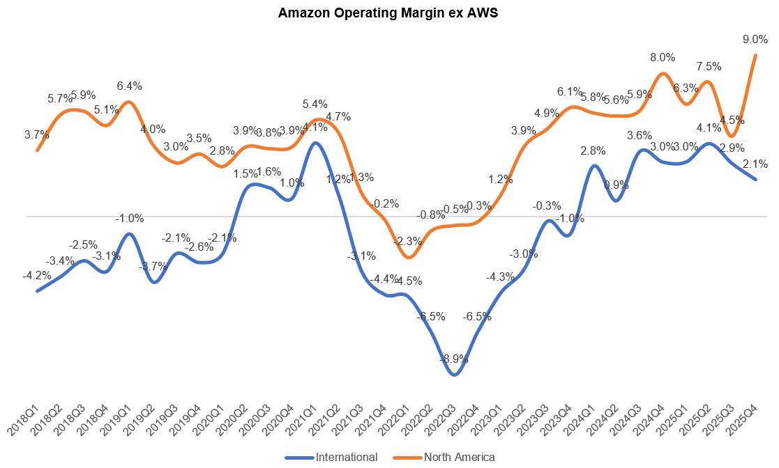As I repeatedly mention in almost every quarter, Amazon retail business continues to be somewhat underestimated. Investors have complained a lot about retail overbuild during the Covid period, but notice what happened to the margin now. Even though North America segment was largely ~3% to ~5% operating margin business pre-Covid, it just reported 9% operating margin. In fact, Amazon had several one-off charges in Q4: a) $1.1 Billion tax dispute which affected the international segment, b) $730 Million severance costs which impacted all three segments, and c) $610 million asset impairments for their store business affecting North America segment. When you adjust for these one-off charges, the adjusted operating margin in North America was likely ~10%. Similarly, even though it may appear international segment’s operating margin went down significantly in 4Q’25, adjusting those one-off items would actually lead to margin expansion YoY.