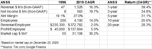 Founded in 1970, Ansys (Ticker: ANSS) came to IPO in 1996. A microcap with only $55 Mn market cap, Ansys has become one of the most successful stocks in the last 25 years. Looking at the CAGR return over different time horizon, it is clear Ansys has created enormous wealth for its shareholders.