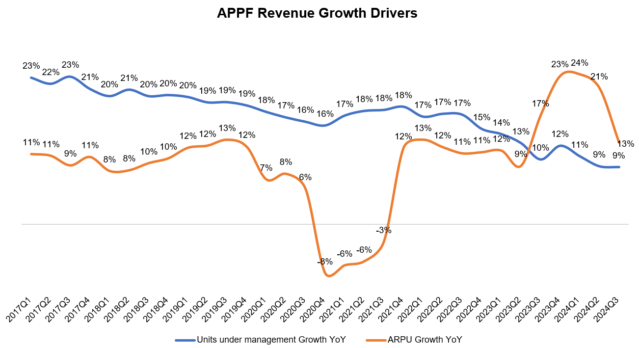 While I went to a more granular drivers in my Deep Dive, let me simplify here. There are essentially two primary drivers for APPF's revenue growth: a) increasing units under management, and b) increasing Average Revenue Per Unit (ARPU) which is calculated as just revenue divided by average units under management.