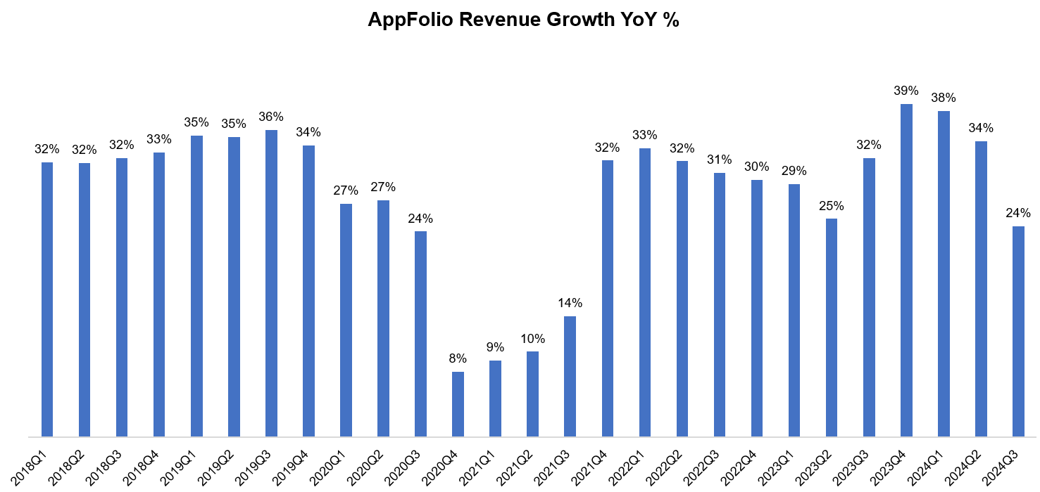 For much of APPF's history, increasing units under management was their primary driver for growth. However, in the last five quarters, it was ARPU that's driving their topline. One of the key drivers for ARPU growth in recent quarters was eChecks, or electronic checks, which allows tenants to pay rent online. AppFolio started charging $2.49 per transaction for all eCheck payments on July 31, 2023. Right after implementing this, APPF's ARPU growth shot up in 3Q'23 and stayed higher than 20% for the next three consecutive of quarters. As APPF overlapped that quarter now, ARPU growth came down to just ~13% in 3Q'24.