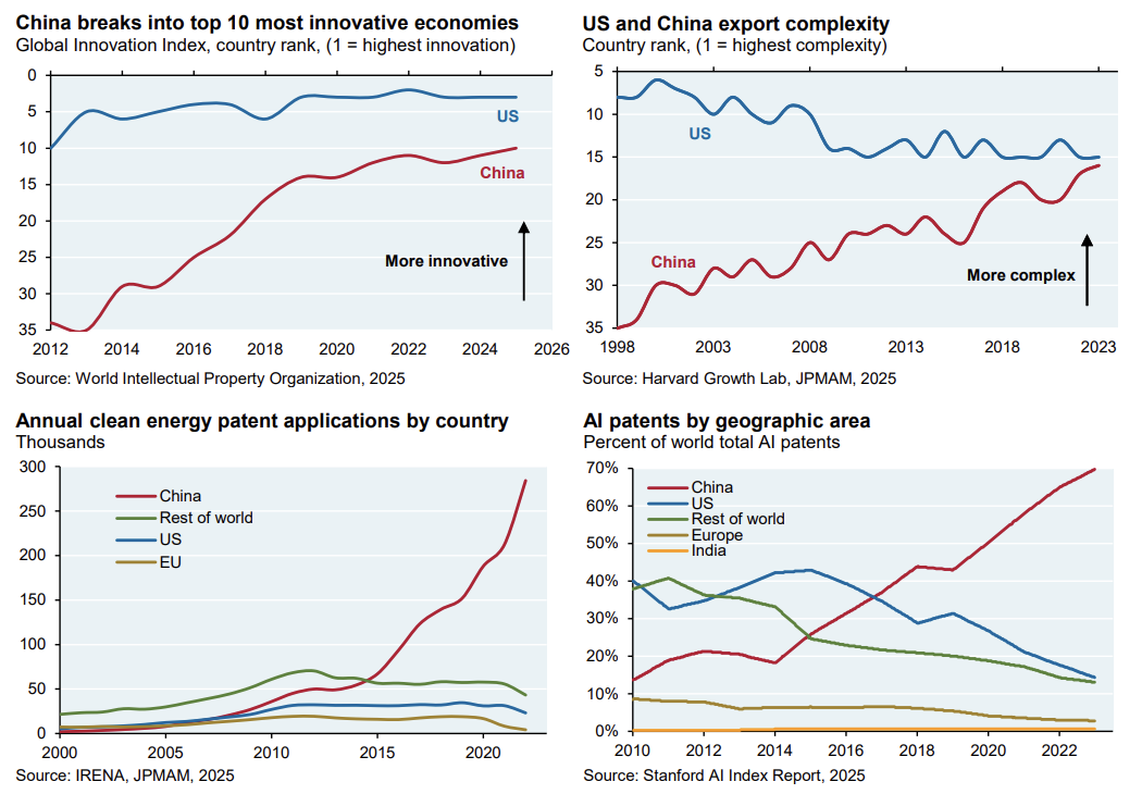 “Let’s start with a basic premise: China has been steadily climbing the innovation food chain across a range of industries. The first chart shows China breaking into the top ten on innovation, while the second shows China and the US converging with respect to the complexity of exported products. China has also been outpacing the rest of the world on clean energy patents, AI patents and nuclear engineering research.”