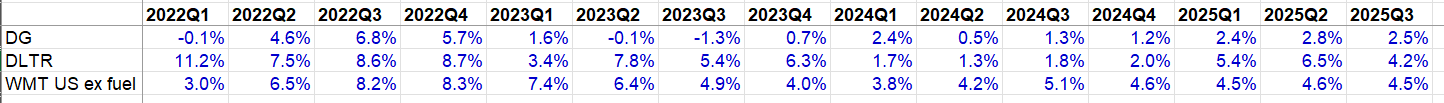 DG and DLTR had 2.5% and 4.2% Same Store Sales (SSS) growth respectively in 3Q’25. They both make Walmart’s (WMT) SSS number look even better as WMT reported 4.5% SSS in 3Q’25 despite being ~17x the size of DG.