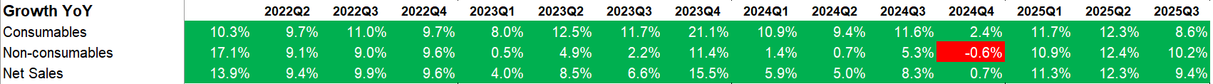 Just like DG, DLTR’s non-consumables also outpaced consumables growth in 3Q’25. Moving to multi-price segment (above $1) has proved to be the real gamechanger here. Management had a good detailed discussion on how multi-price can have a profoundly positive impact on profitability by explaining what they witnessed in Halloween assortment:
