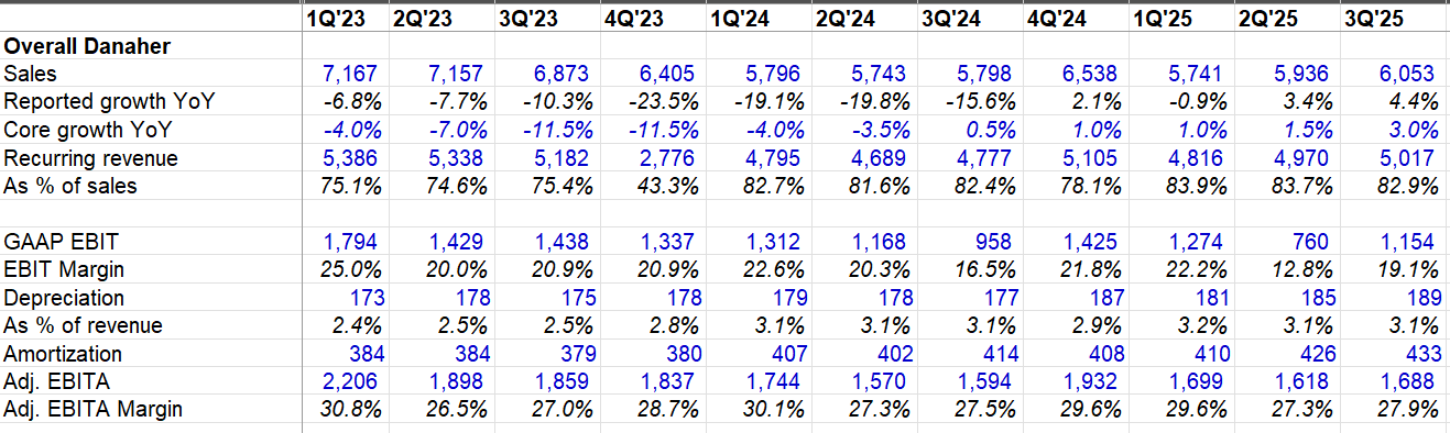 Danaher reports its business in three broad segments: a) Biotechnology, b) Life Sciences, and c) Diagnostics. Majority of revenue in all three segments come from recurring revenue through consumables that are spec’d into regulated process or the specific equipment Danaher sells to the customers. This recurring portion of revenue gradually increased from 75.4% in 3Q’23 to 82.9% in 3Q’25.