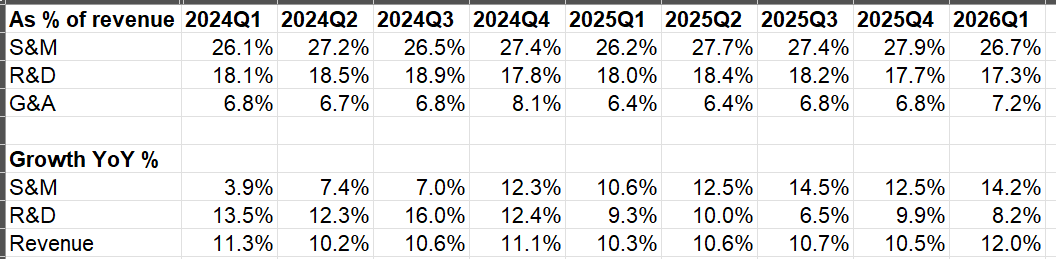 Moreover, while Adobe’s margin doesn’t seem to show much of a pressure today, you will notice that Sales & Marketing (S&M) in the last four quarters has consistently grown at least ~200 bps faster than revenue. They managed to maintain their operating margins by keeping R&D expenses growth noticeably slower than revenue growth.