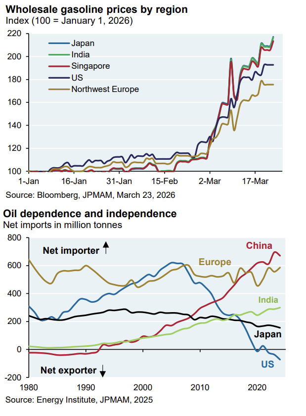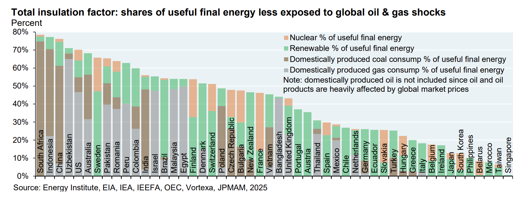 So, it was surprising for me when I noticed that China was actually ahead of the US in terms of “total insulation factor” when it comes to global oil & gas shocks. The "total insulation factor" indicates the share of a country's useful final energy that is less exposed to global oil and gas shocks. JPM calculated it by adding together a country's reliance on four specific energy sources: domestically produced gas, domestically produced coal, nuclear power, renewables (such as biofuel, hydro, wind, solar, and biomass). China has a total insulation factor of 76%, while the US has a total insulation factor of 70%. China scores higher primarily because of its massive reliance on domestic coal (54% of useful final energy), which accounts for a larger share of its energy mix than the US's primary domestic buffer: natural gas (44.5% of useful final energy).