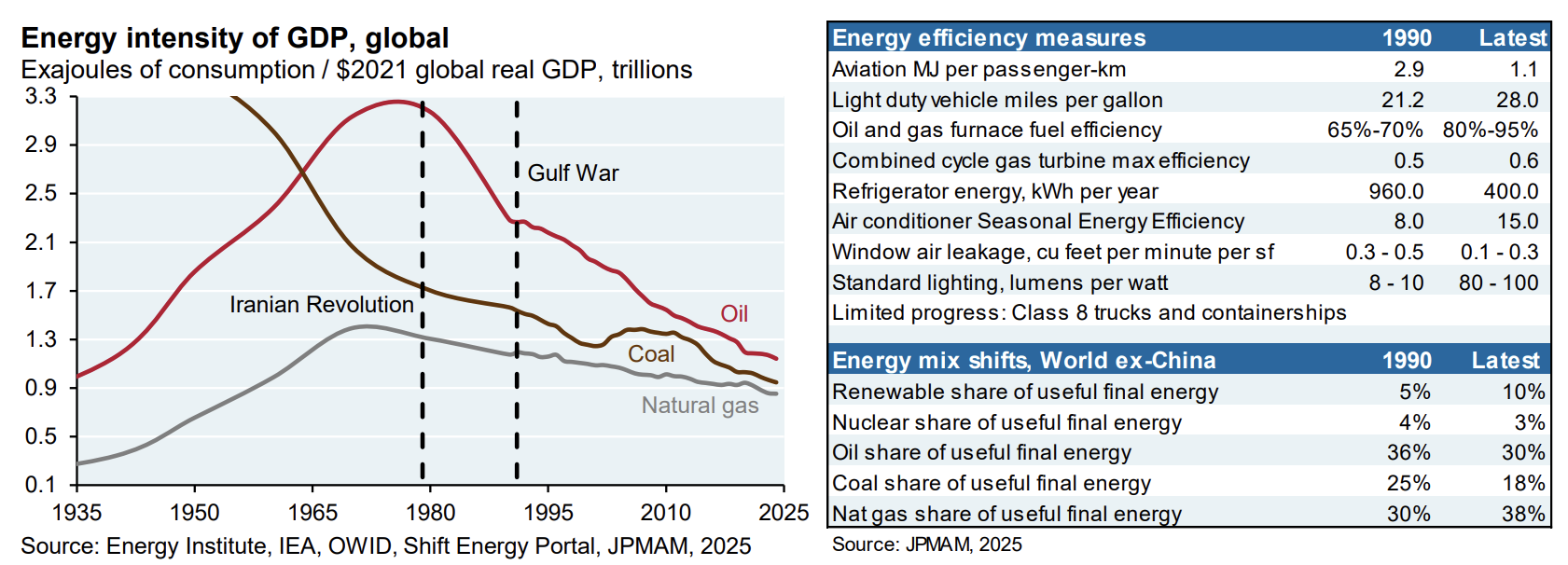 “…the oil intensity of global GDP has plummeted since its 1970’s peak and is only half the level it was at the time of the Gulf War in 1990. Even the natural gas intensity of GDP has declined since 1980 despite natural gas consumption tripling since then.”