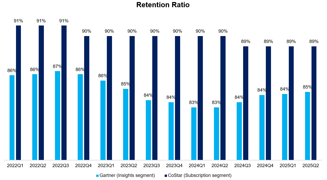 Indeed, Gartner actually mentions ~75% of its contracts are multi-year in nature whereas CoStar’s subscriptions typically renew at one-year increment. Given the average duration of the contract is 1.7 years for Gartner, the underlying retention rate for its subscription services is likely a bit worse than reported retention compared to CoStar, but unlikely to be materially worse than reported retention.