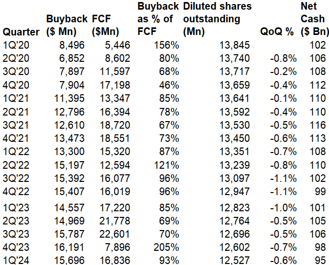Google mostly utilized all of its FCF to buyback shares, declining shares outstanding by 0.6% QoQ. For the first time, they have declared cash dividend of $0.20/share.