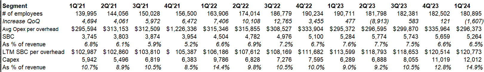 Google’s headcount declined QoQ, but capex as % of revenue increased to 14.9% in 1Q’24 which was highest since 3Q’19. Google seems to be balancing between headcount and emboldening their infrastructure investments.