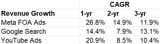 If it were a trivia question which of these three businesses (Meta's Family of Apps' or FOA Ads, Google Search, and YouTube Ads) generated highest topline growth over the last three years, my guess is most people would get it wrong. While many may think growth in Meta's FOA has been extraordinary, Search actually outpaced FOA and YouTube ads over the last 3-year period. Meta's FOA just appeared more impressive this quarter primarily due to easier comps.