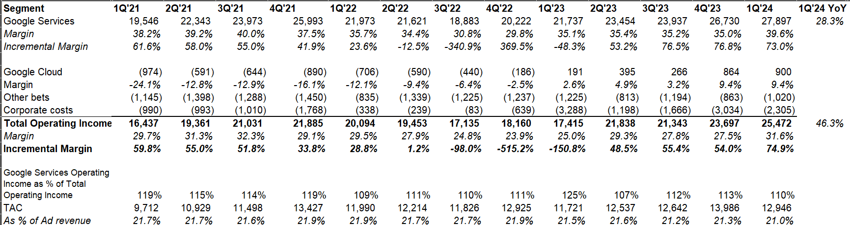 Google Services business posted 39.6% operating margin which was very close to its all-time high reported margin in this segment back in 3Q'21.