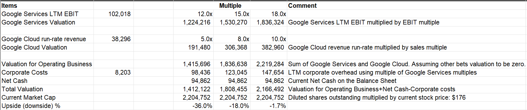 Market is likely valuing Google Service segment at ~20x LTM EBIT and the Cloud business at ~8-10x revenue multiple. I think it's fair to say despite plenty of bearish narrative around Google, it's hard to find figment of that in the financials. Management seems rather confident that early numbers indicate GenAI is not really a threat to Search economics. As a result, investors seem to be finally willing to embrace Google as one of the winners of "tomorrow".