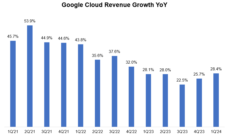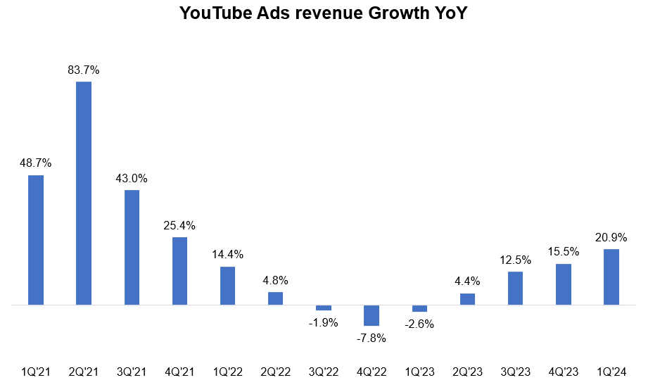 Cloud revenue growth again accelerated. Interestingly, Google expects YouTube overall (ads+ subscriptions) and Google Cloud will have combined $100 Bn revenue run-rate by the end of 2024 which implies pretty sustained growth momentum throughout the year.