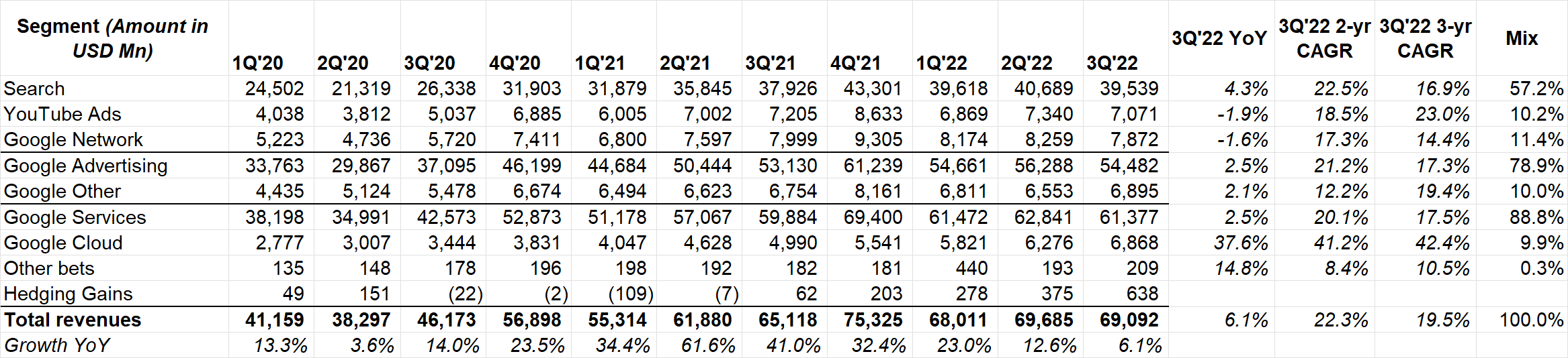 YouTube ads and Google Network revenue declined YoY. Cloud continued its growth momentum.