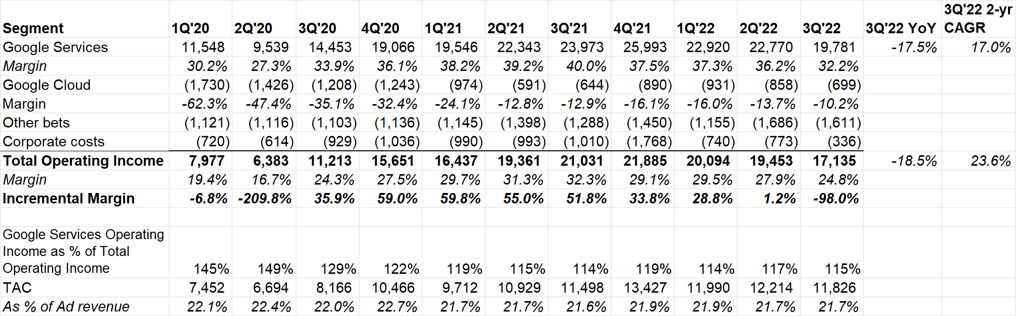 While Google Services EBIT declined by 17.5% YoY, given FX is a larger headwind for EBIT, EBIT declined by ~7-8% YoY FXN. Google Cloud's margin was -10.2% which was its highest ever. Cloud is likely to be a nice tailwind for margin in 2023.