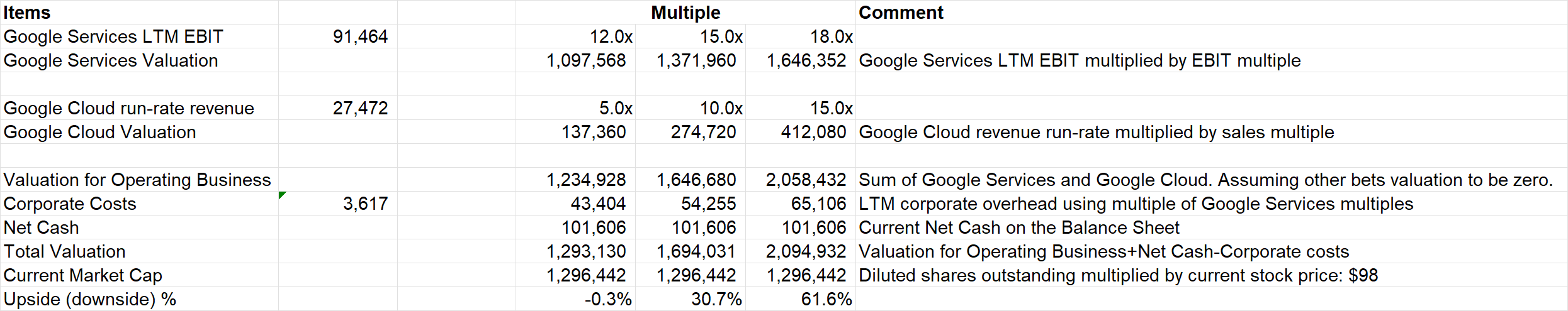 It is hard to argue Google's valuation is expensive. The core Google Service business is trading at ~12x LTM EBIT if we value Google Cloud at 5x run-rate revenue.