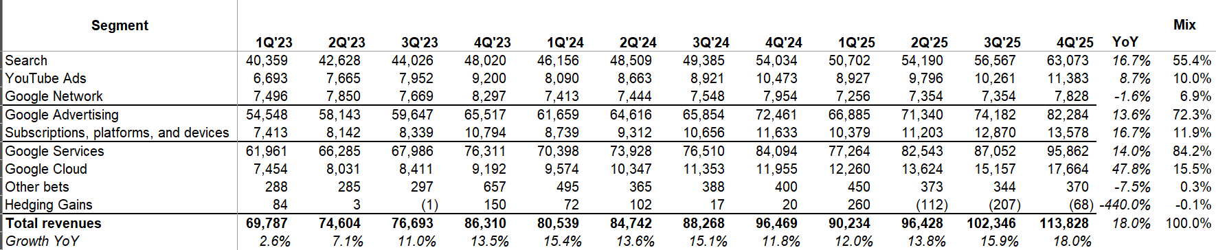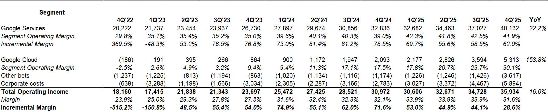 Google Services continues to post >40% operating margin. The fact that for the last eleven quarters their incremental margins have been consistently above 50% (it was 62.0% in 4Q’25) indicates that we may still have room for further margin expansion.