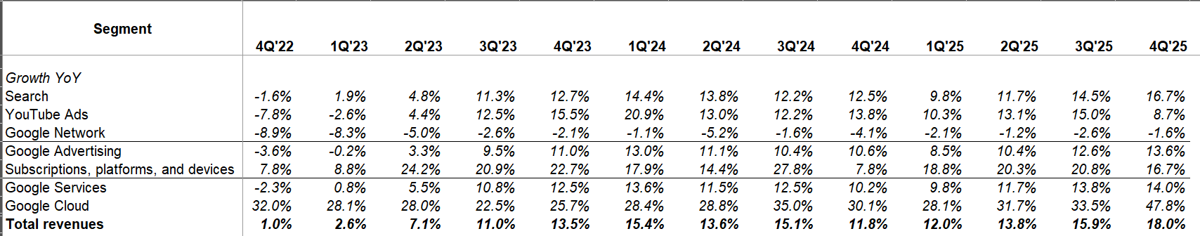 The jaw dropping moment from the earnings release was, however, Google Cloud’s margin. Even in 2Q’20, Google Cloud had -47.4% operating margin. Yes, that’s negative. In 4Q’25, they posted +30.1% operating margin! I don’t think I have ever seen such a margin turnaround in my investing career. From a distant unprofitable laggard in hyperscaler race to reach a touching distance of the operating margin of AWS while simultaneously accelerating revenue growth to ~50% is nothing short of mind boggling.