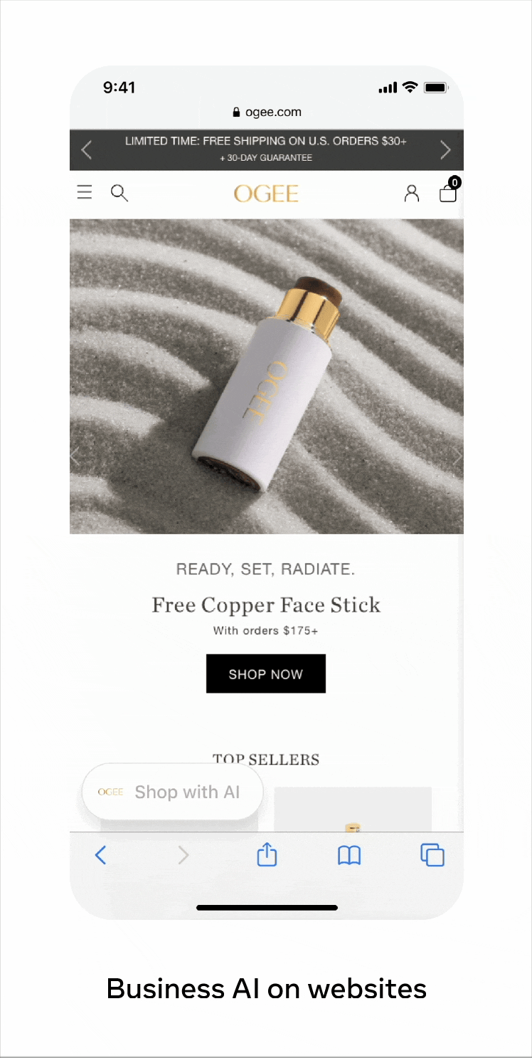 “Meta is launching new Business AIs – a turnkey sales concierge and AI agent designed to help you engage, convert and build lasting relationships with your customers in the AI era. With just a few clicks, you can configure Business AI for your WhatsApp and Messenger chats, Facebook and Instagram ads, and now, also on your website.