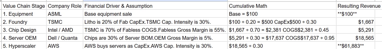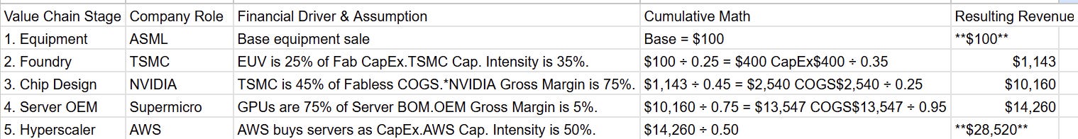 Huang’s point is well taken; however, I think the reason Huang is so happy to pay TSMC and ASML’s margins because he is at least so far able to defend his own margins. His own customers i.e. hyperscalers may be grappling with a different reality. I asked Gemini to show me an illustrative example how $100 sales by ASML used to flow through the compute value chain to hyperscalers ten years ago.