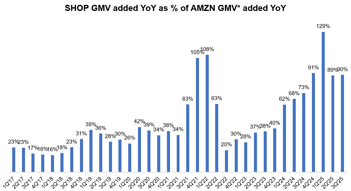 One of the key reasons Shopify’s incremental GMV growth nearly matches Amazon’s is their much stronger presence outside North America. While Amazon marketplace operates in 23 countries, it is still very much US centric. For example, while we don’t know Amazon’s exact growth by geography only in retail business, we do know Amazon’s North America revenue increased by $10.7 Billion whereas International revenue increased by only $5 Billion YoY in 3Q’25. In contrast, Shopify mentioned half of their GMV dollar growth in Q3 came from outside North America. It is lot easier to scale Shopify’s platform internationally than to scale Amazon’s marketplace.