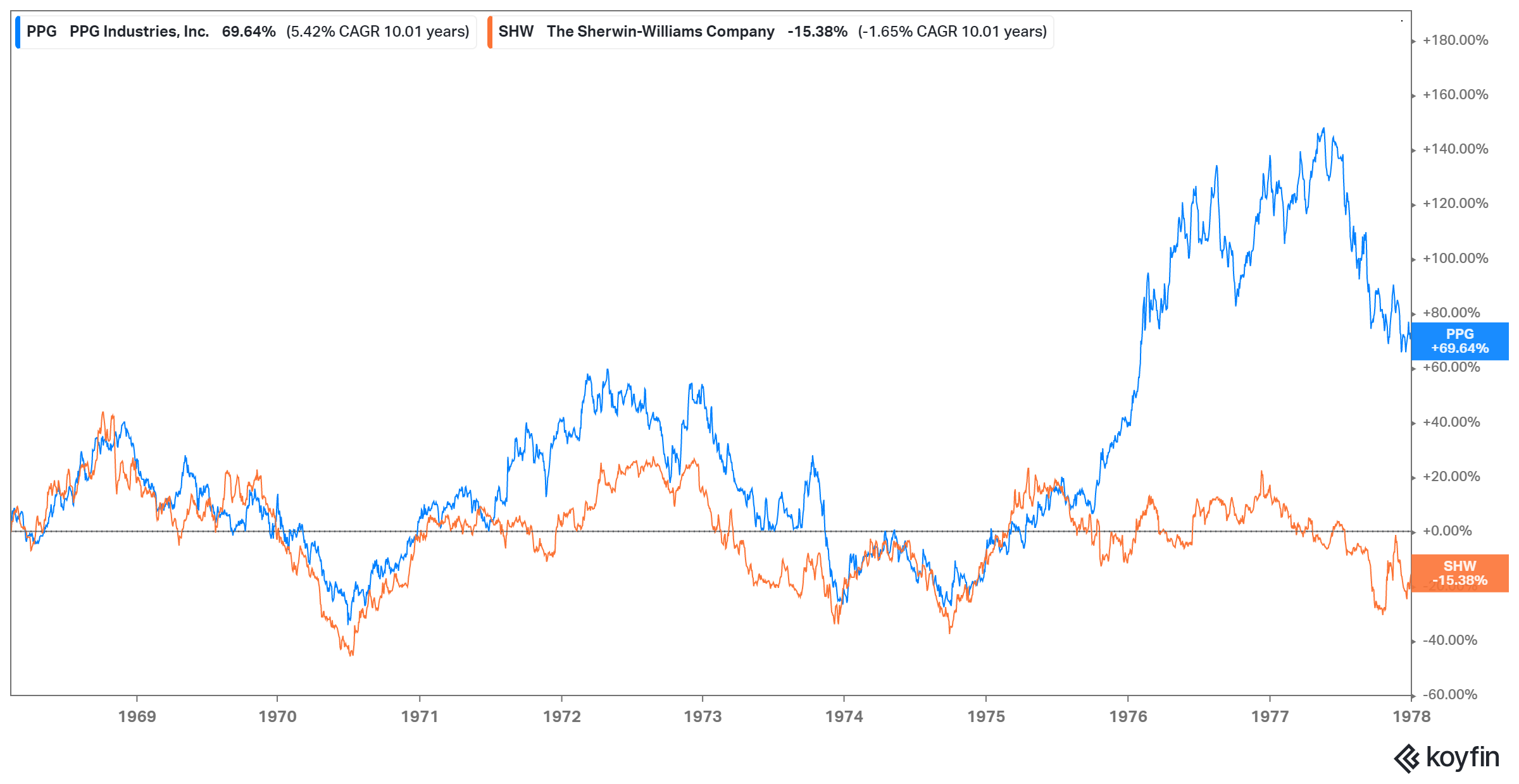 Given PPG and Sherwin Williams are the closest competitors and have been publicly listed for decades, I was curious to see their performance against each other decade by decade. I use KoyFin (and Tikr) for data, and KoyFin only seems to have data from 1968. So I looked at these two companies performance every 10 years since 1968. Sherwin Williams experienced a lost decade in the first 10 years (1968-1977) whereas PPG was +70% during the same time. Since then, Sherwin Williams has outperformed PPG in every single decade: