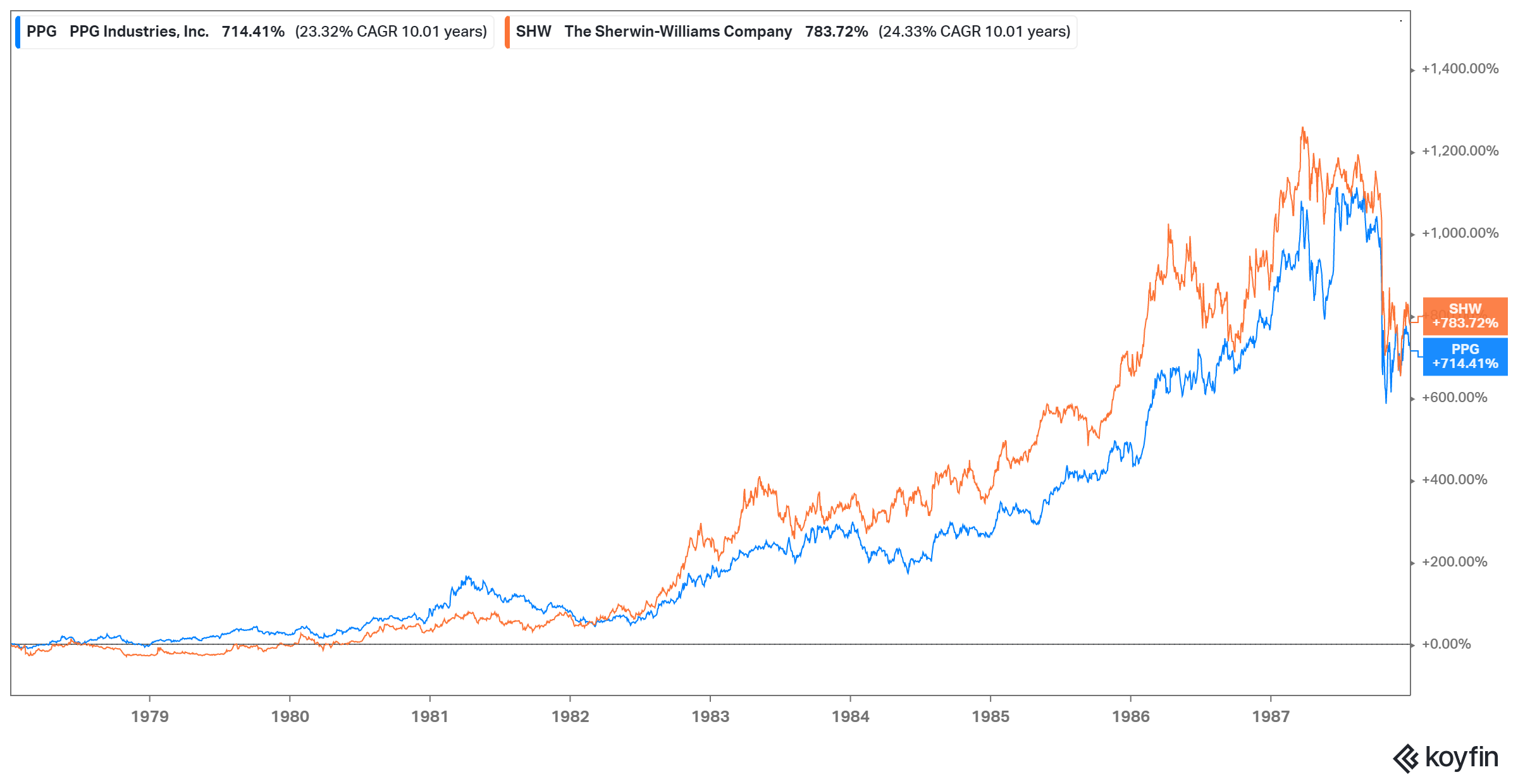 1978-1987: SHW +783% vs PPG +714%