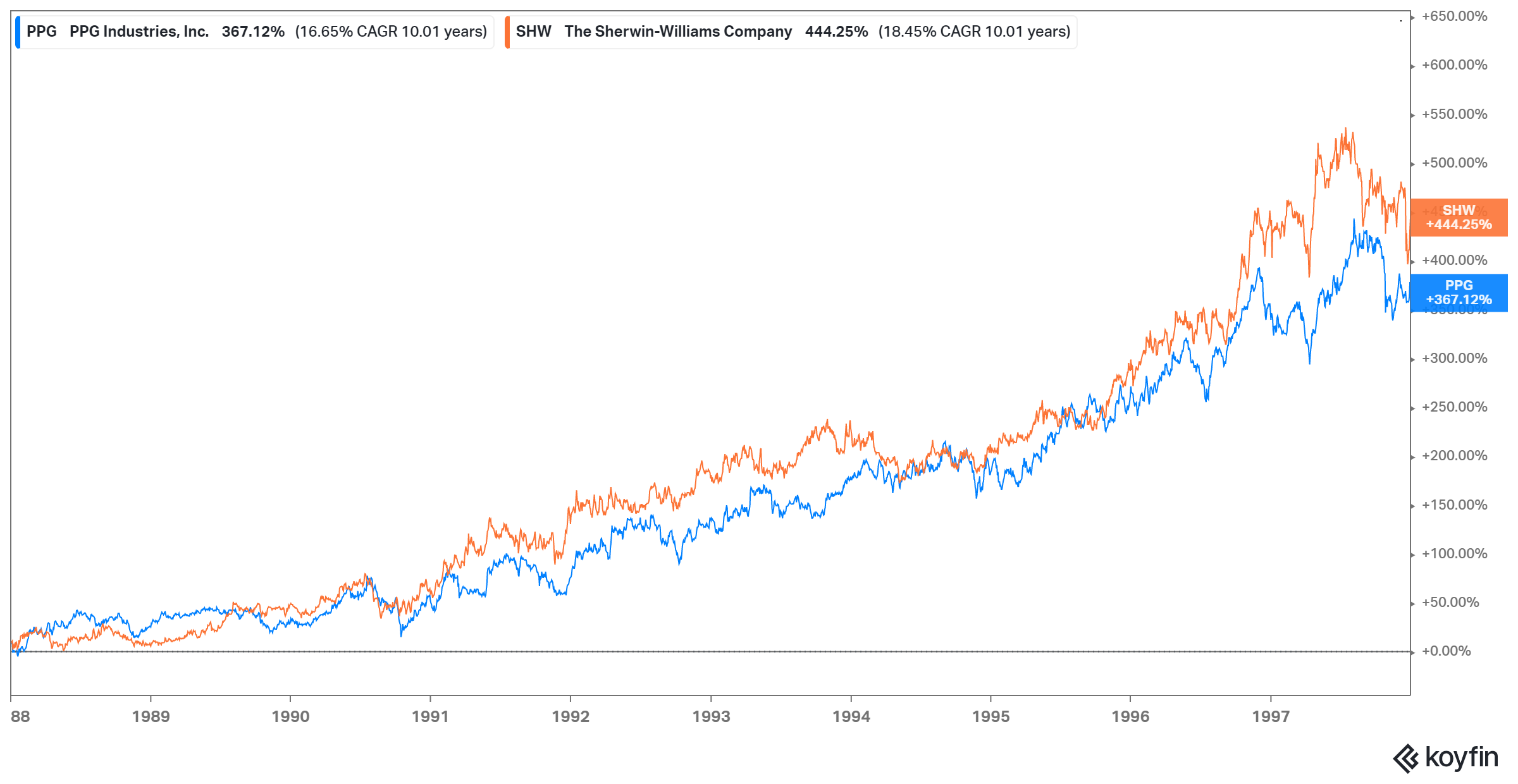 1988-1997: SHW +444% vs PPG +367%