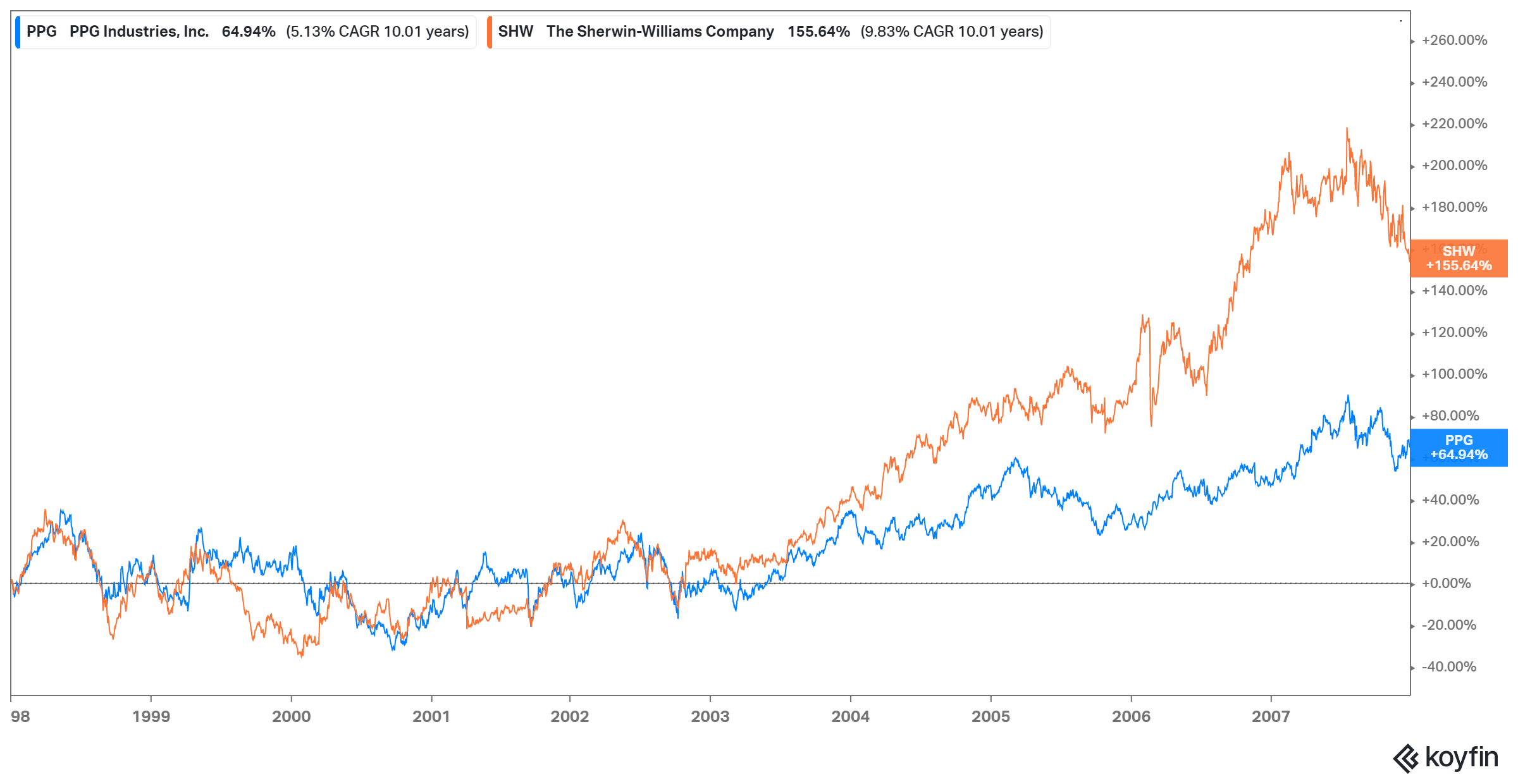 1998-2007: SHW +155% vs PPG +65%