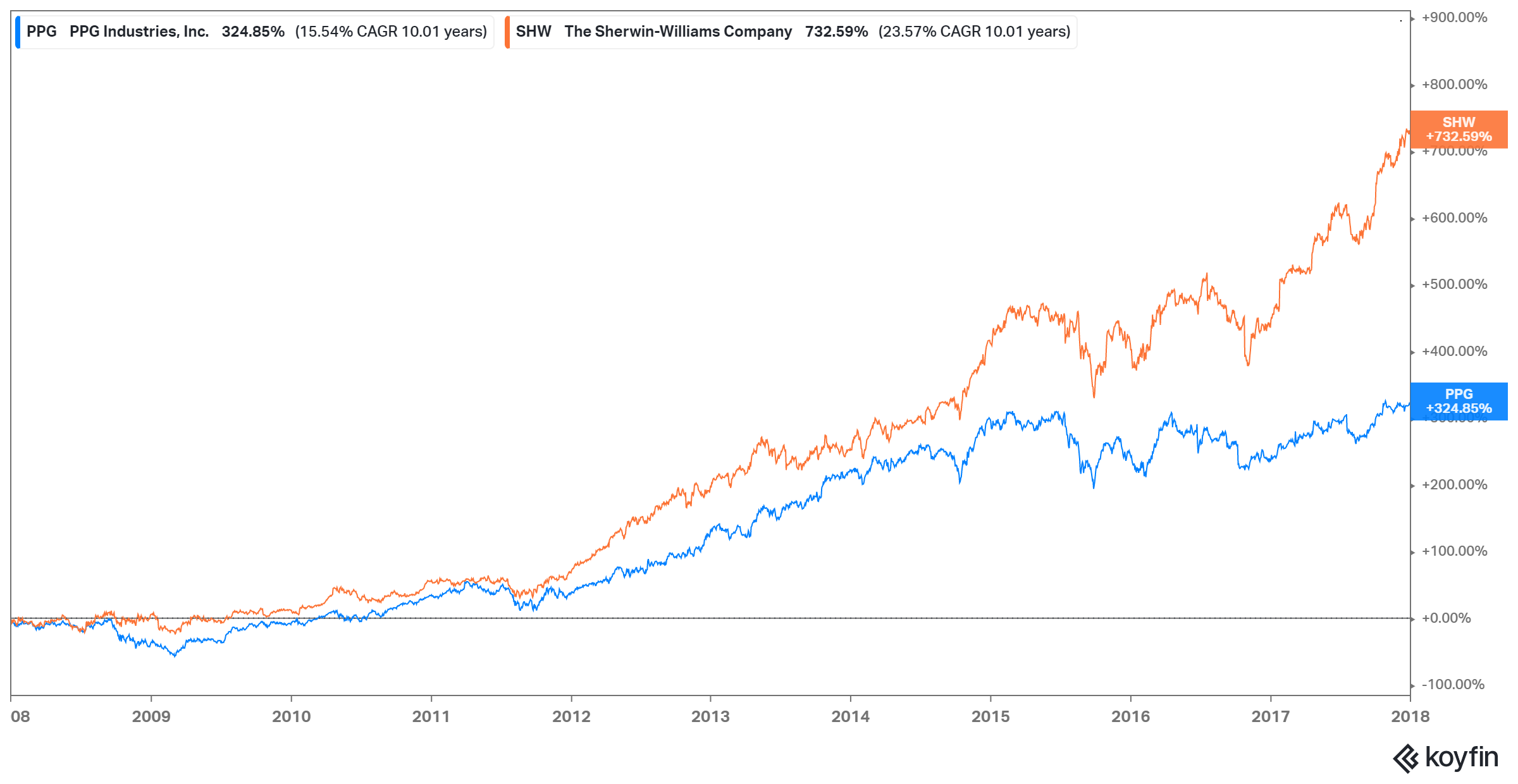 2008-2017: SHW +733% vs PPG +325%