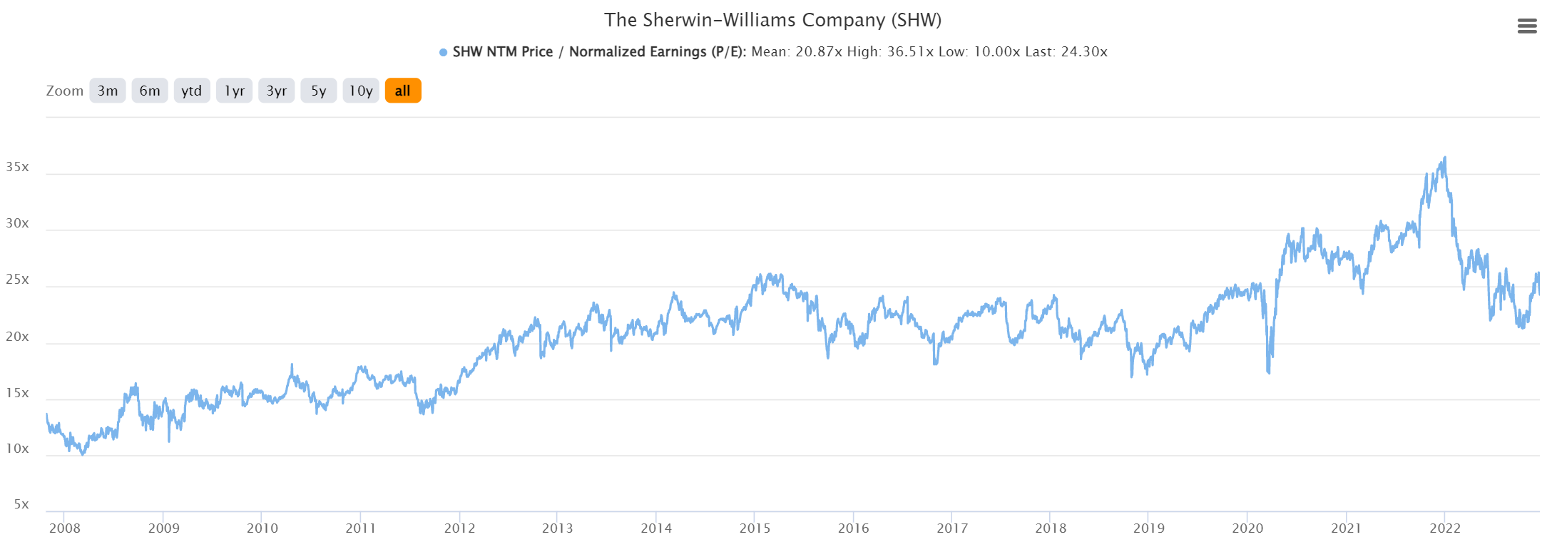 Sherwin Williams: ~34x or ~20% CAGR
