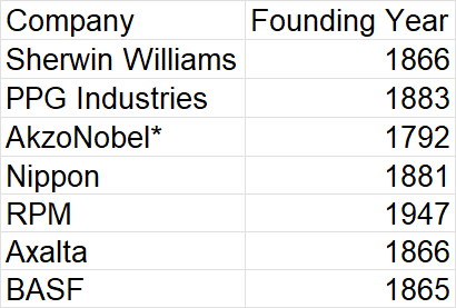 One thing that I noticed while studying this industry is just how old these companies are. These companies are older than perhaps many countries as most of the leading players in coating industry were founded in the 19th century! Sherwin Williams itself was started 90 years after the independence of the US .