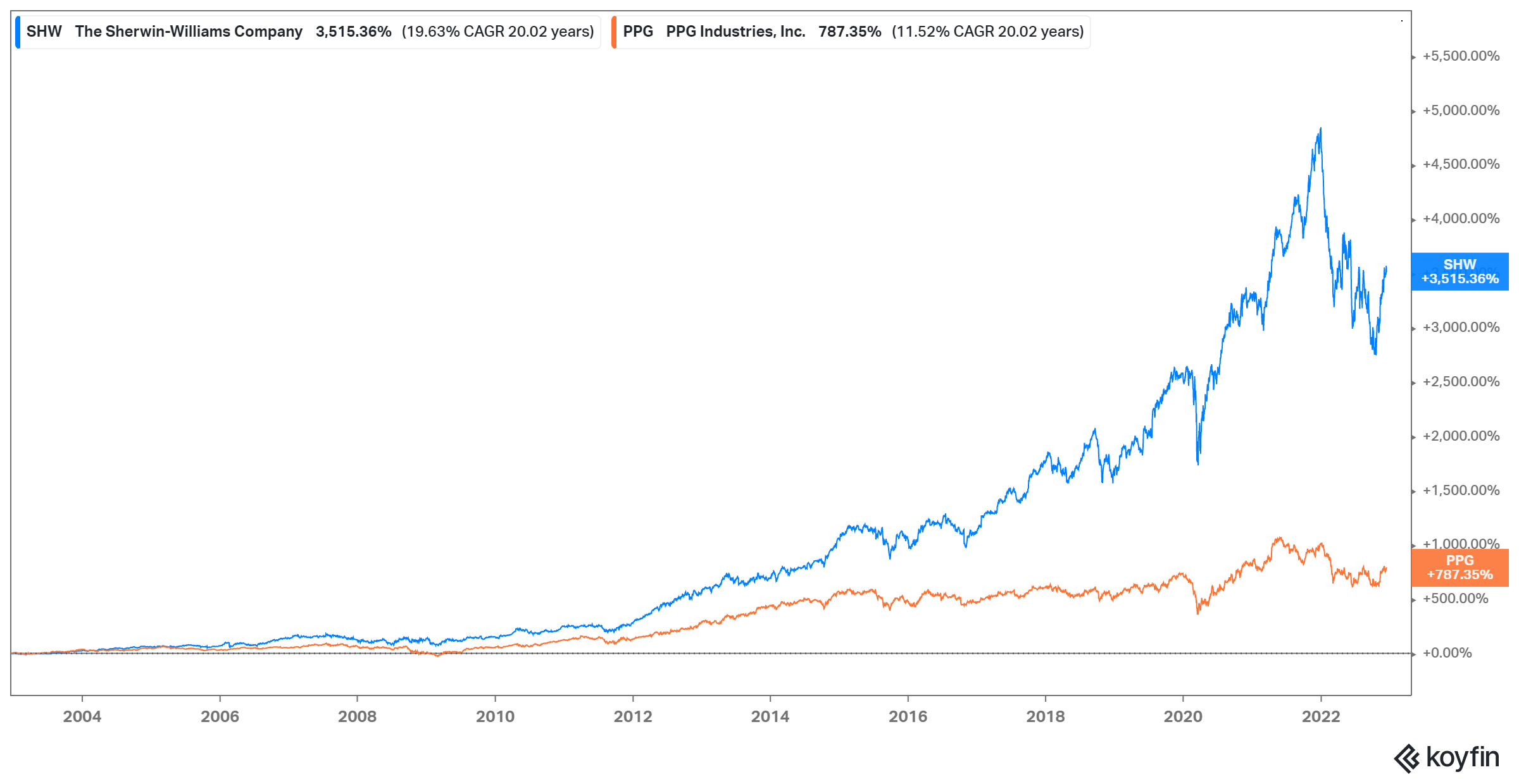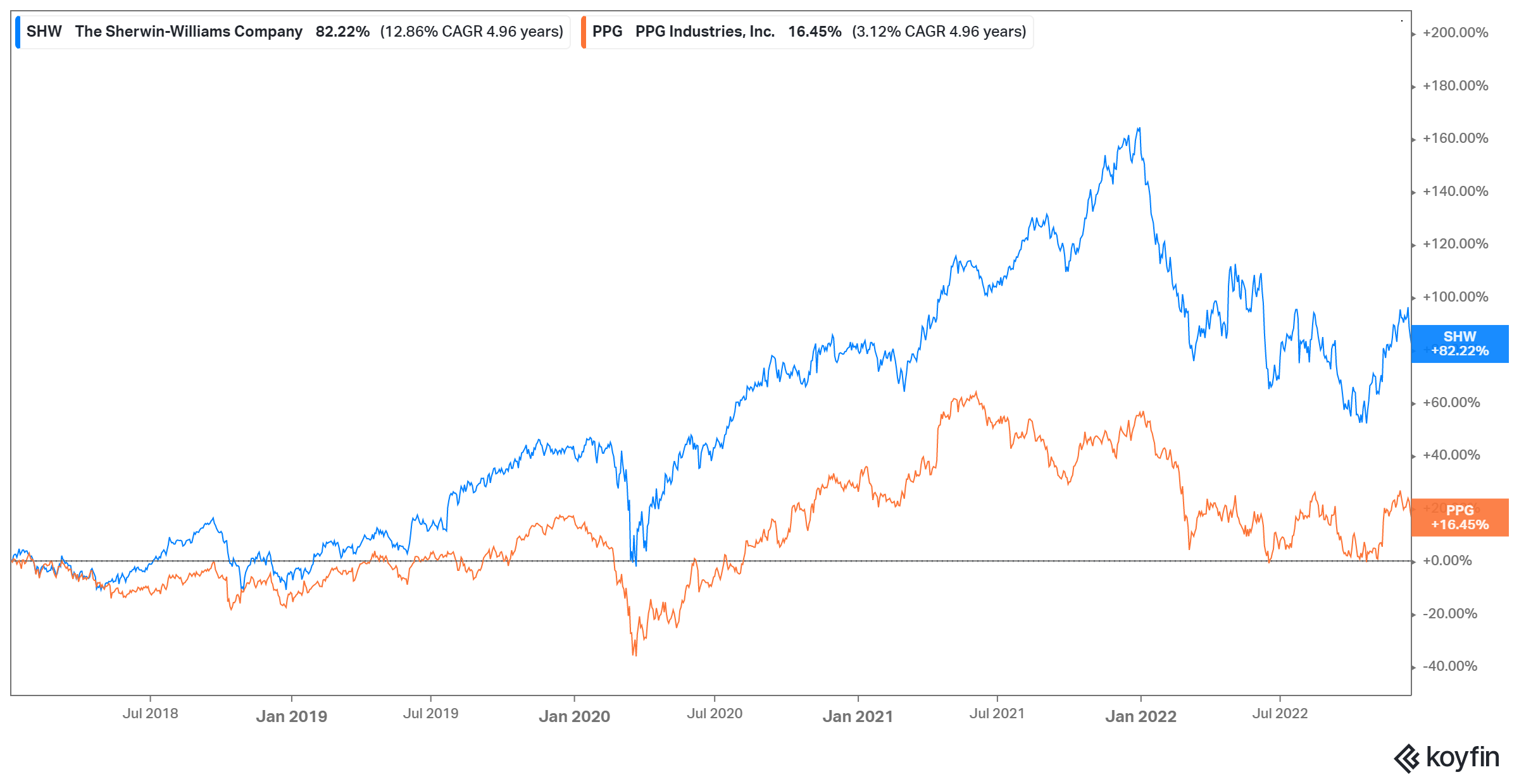 2018-2022 (Dec 16, 2022): SHW +82% vs PPG +16%