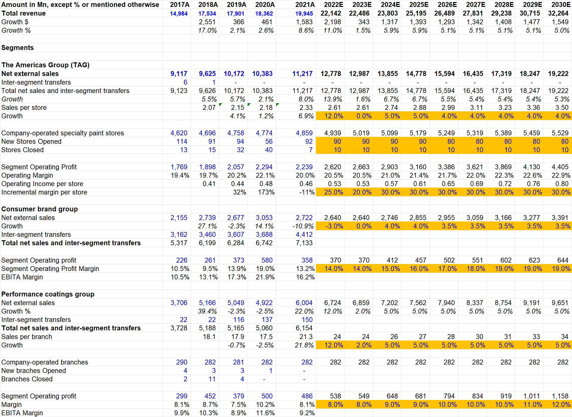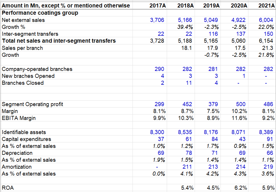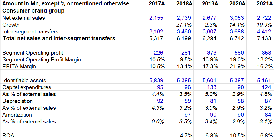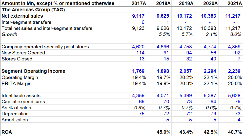 Please note 62% of this segment's 2021 sales was just intersegment transfer of products primarily sold through TAG. ROA for this segment was MSD to HSD in the last five years. Painting manufacturing and distribution facilities (58 and 31 respectively in Consumer Brands Group) are considered as part of assets of CBG which weighs on CBG's ROA. Moreover, Goodwill and intangibles are material part of its identifiable assets which likely puts a downward pressure on its ROA as well, but incremental ROIC should be lot higher than reported ROA. Consumer Brand segment's operating profit was only 16% of overall company's operating profit.