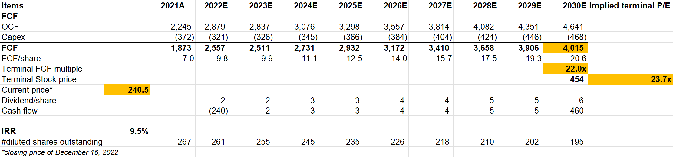 Valuation: To generate ~9.5% IRR, I had to assume 22x FCF multiple in terminal year. Please note I modeled net debt to EBITDA ratio to be 3.1x, set aside $300 mn cash for acquisition each year, assumed 30% of net income to be paid as dividends, and the rest of FCF was utilized to buyback shares in my model.