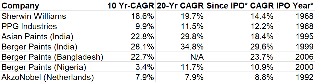 You would probably be surprised how much shareholder wealth was created in the public markets across the world by this "boring" industry. Over the last 20 years, S&P 500 and NASDAQ 100 became ~5x and ~11x respectively. Here's how some of the successful paint companies fared around the world during this timeframe i.e. 20 years: