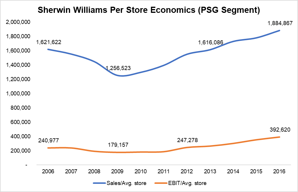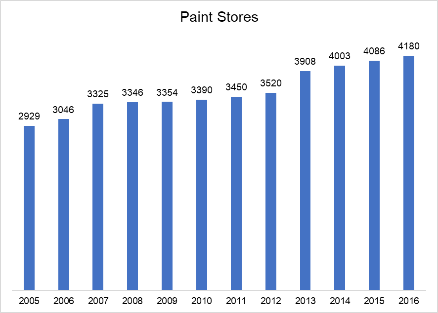 Of course, since this isn't same store sales and profit numbers, my calculation on per store economics cannot be precise. I wondered whether store growth itself may have affected the calculation for per store economics. That doesn't quite seem to be the case as number of stores grew somewhat steadily in 2006-16 except for 2013 as SHW acquired Comex in November 2012.