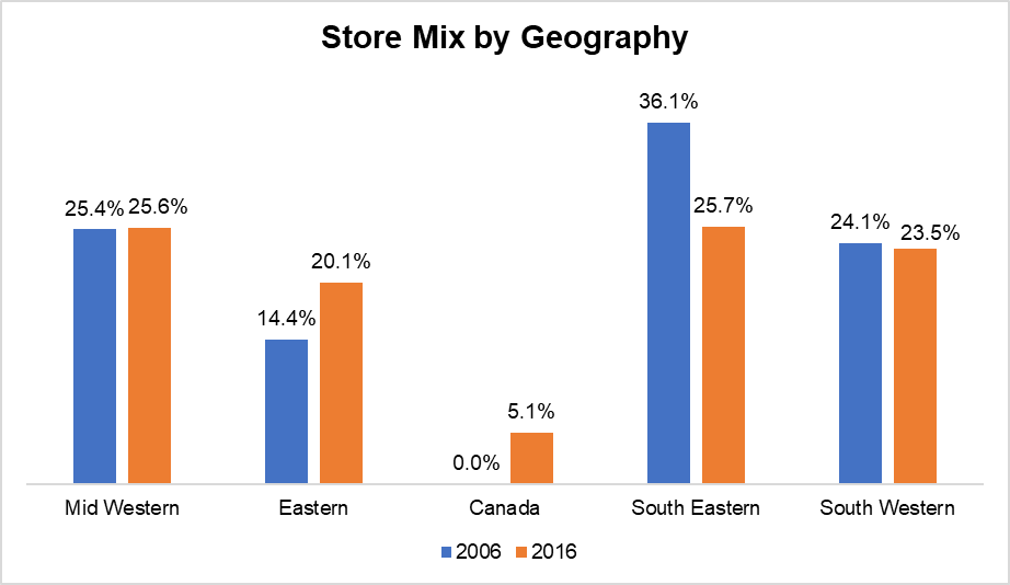 One other reason my calculation of incremental profitability could be overly optimistic is how the store mix itself evolved over time. PSG segment used to be divided in five divisions based on geographical regions: Mid Western, Eastern, Canada, South Eastern, and South Western. From 2006 to 2016, Eastern division+ Canada's presence in the overall store mix increased by ~10 percentage points whereas South Eastern's contribution declined by 10 percentage points.