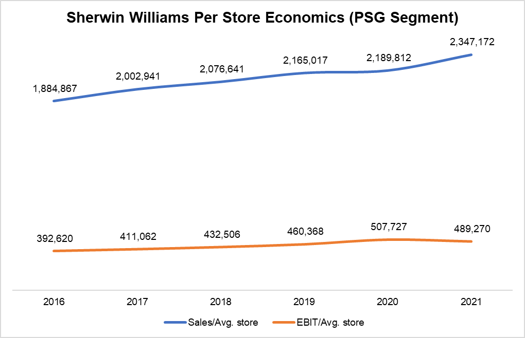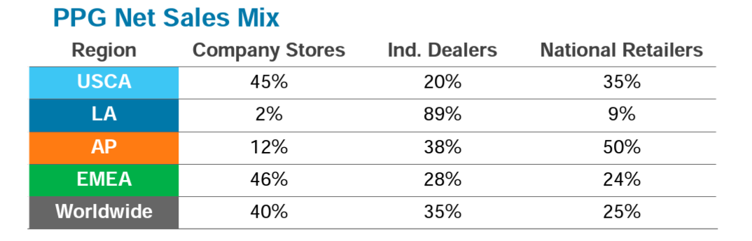 One other question that made me think is the somewhat divergent strategy of Sherwin Williams and PPG in distribution. While Sherwin Williams continues to add 80-100 new stores every year, PPG is closing stores and seems to be focusing on their partnership with national retailers. PPG doesn't disclose its number of stores, but it does disclose that 45% of its sales comes from its own stores, 20% from independent dealers, and the rest 35% from national retailers. Sherwin Williams doesn't disclose in exact terms, but if we think Consumer Brands Group as proxy for National and independent retailers, it only had 14% contribution to total sales in 2021. Therefore, it seems these two competitors are leaning towards opposite direction in terms of distribution.