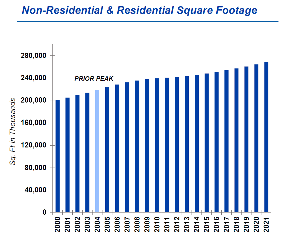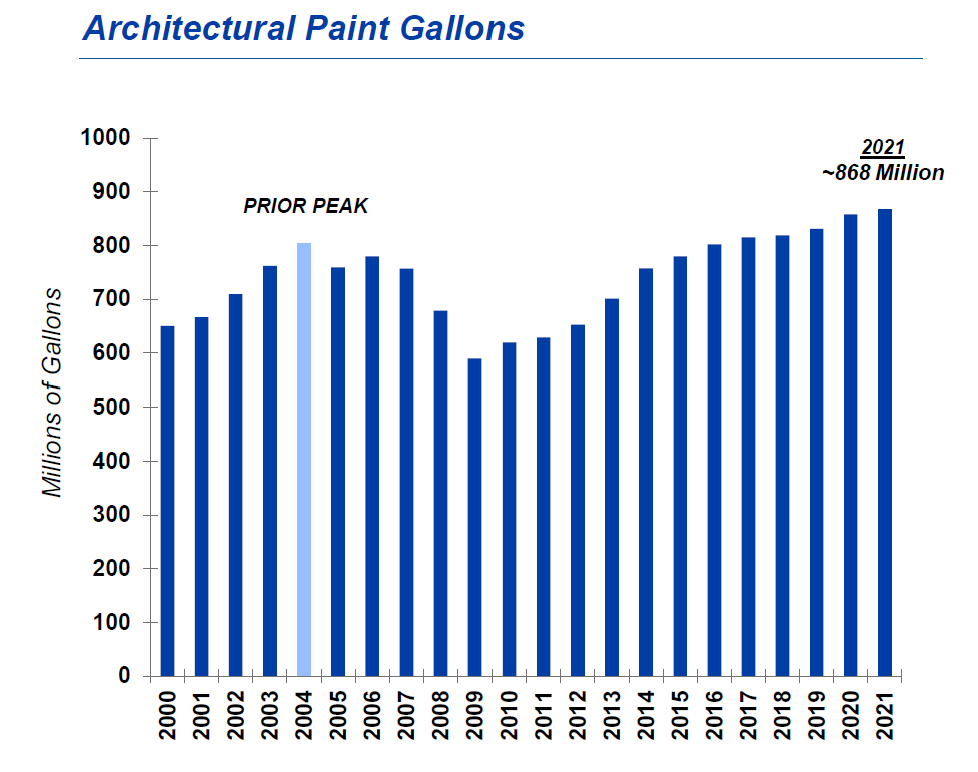 When we look at total residential and non-residential sqft in the US, it is a much more consistent, steady 1% volume growth over the last two decades. Today, there is 23% more residential and non residential square footage out there since the prior paint demand peak in 2004.