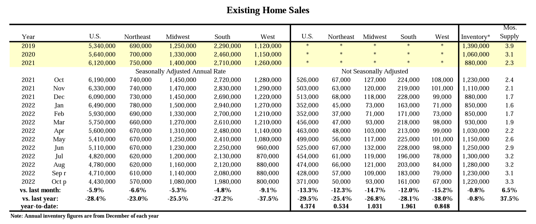 Residential repaint is key driver to Sherwin Williams' topline, and one of the key drivers to repaint is existing home sales. Why? The current homeowner tends to refresh the home with new paint prior to the sale, and then the new homeowner, after just purchasing the home, typically repaints it to make it their own. As you probably know, existing home sales is precipitously falling in recent months as mortgage rates are rising.