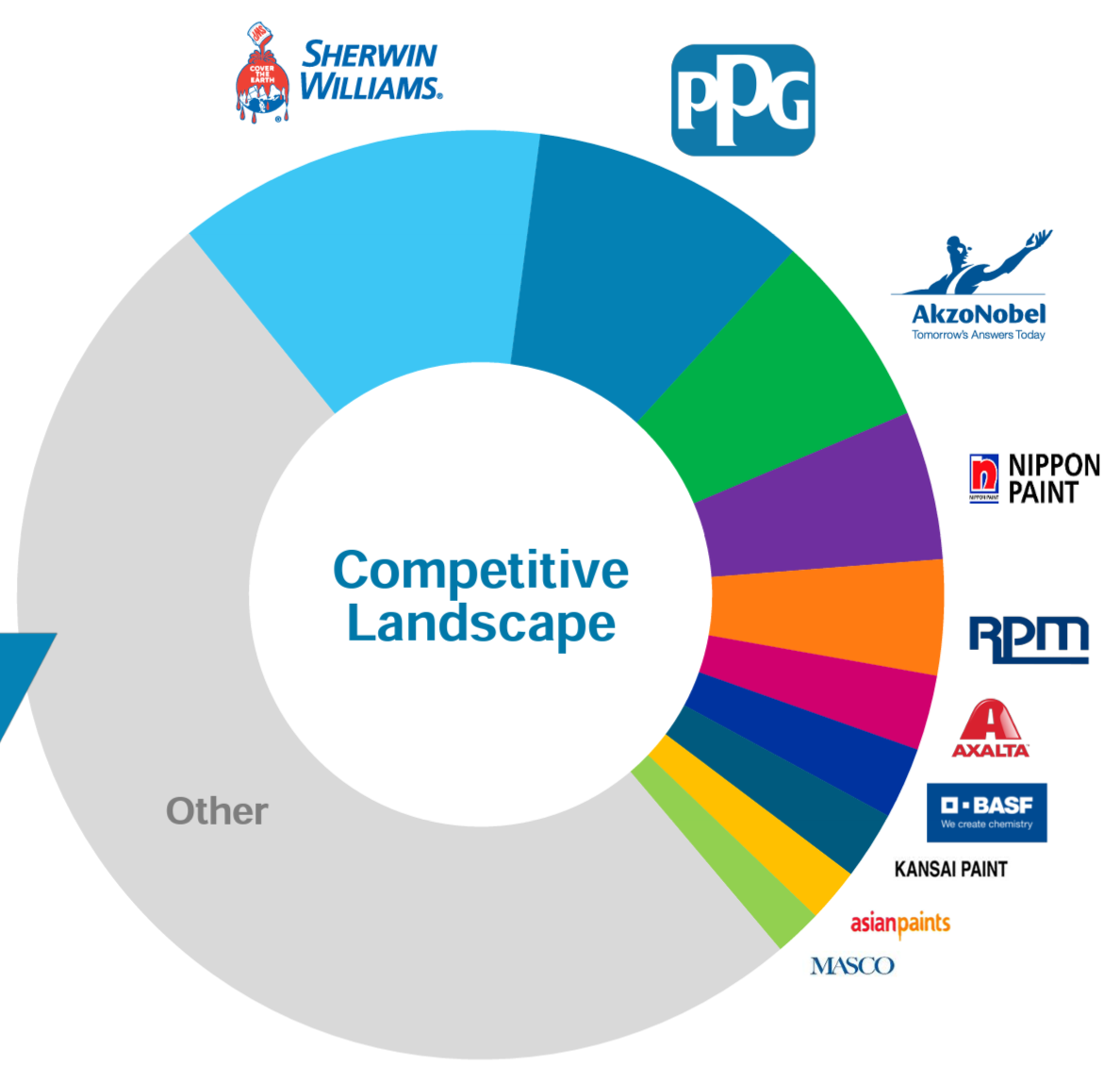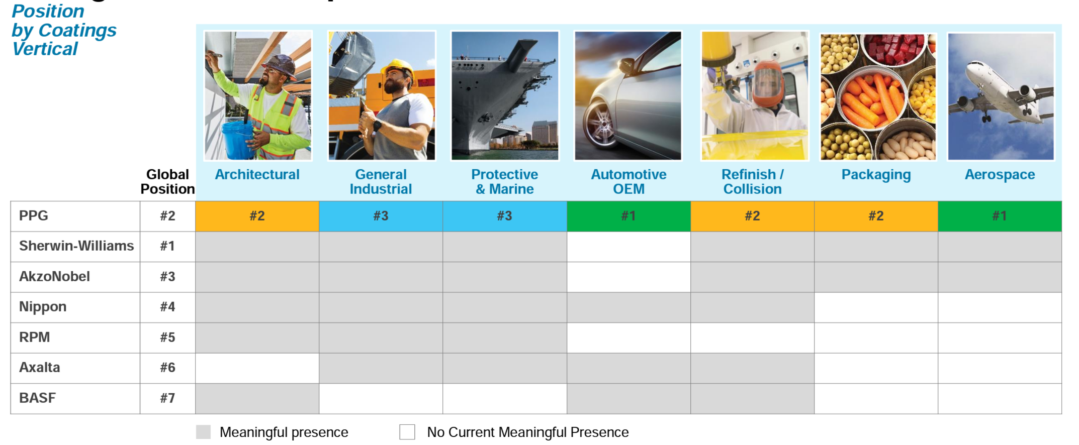 When PPG shared a similar market share data by segment in 2015, it mentioned Sherwin Willams' global market position to be #3 (SHW was #1 in Architectural segment even in 2015; so I'm talking about the overall Coatings industry), followed by PPG at #1 and AkzoNobel at #2. However, following Sherwin Williams' acquisition of Valspar which was at #4 in 2015, Sherwin Williams eventually became #1 global player in coatings industry.