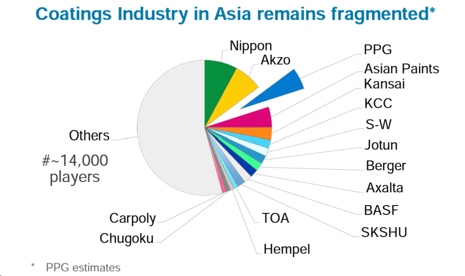 However, even though there seems to be lot of room for consolidation globally, the level of consolidation differs wildly by region. For example, the top three players (Sherwin Williams, PPG, Behr) in North America have ~80% market share whereas top three players in Asia have ~20% market share. This is, of course, not a fair comparison since North America is, well, mostly the US whereas Asia is a huge and incredibly diverse continent with ~50 countries.