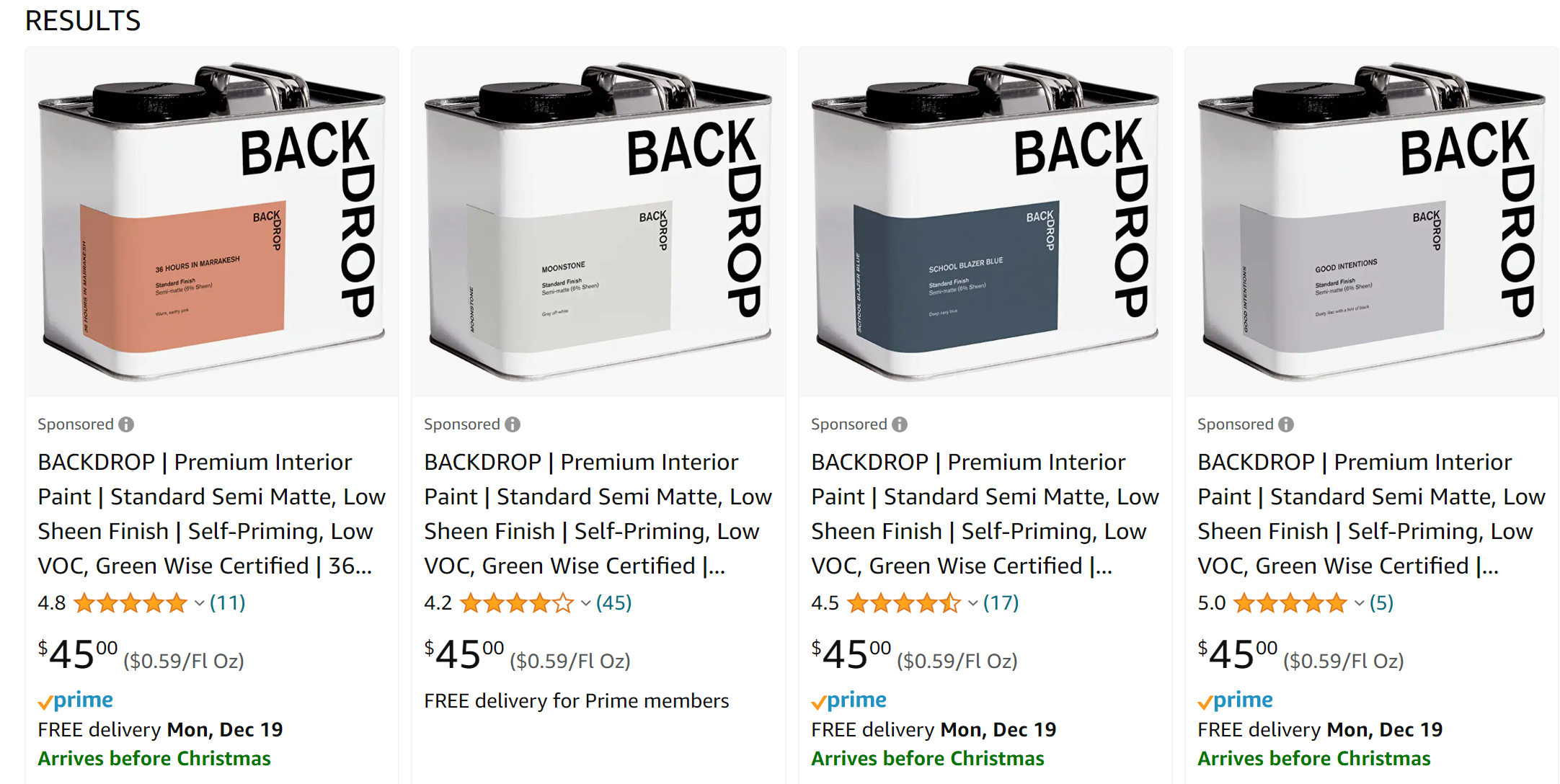 I searched "interior paint" on Amazon on December 13th and here's what the top search results showed me:
