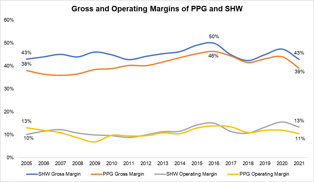 It does seem to me that Sherwin Williams' arguments are much more compelling. If we just look at the numbers, Sherwin Williams consistently posted higher gross margin than PPG, given its greater focus on selling through its own stores compared to PPG's greater reliance on national retailers. However, the operating margins are mostly similar as the higher gross margin of SHW is outweighed by higher SG&A expenses of the own store distribution model. Therefore, it can be tempting to think the choice between either of the distribution strategy is neutral. Even if the operating margins are largely similar, I would much rather own the distribution model than relying on behemoths such as Home Depot. Imagine the scenario in 20-30 years when much of the independent retailers lose most of its share to Home Depot and Lowes and the kind of negotiating leverage Home Depot/Lowes would end up accruing over PPG. Sherwin Williams is certainly playing on the hard mode compared to PPG, and while it may take decades to see the value of playing on the hard mode, I do think it may prove to be worth it.