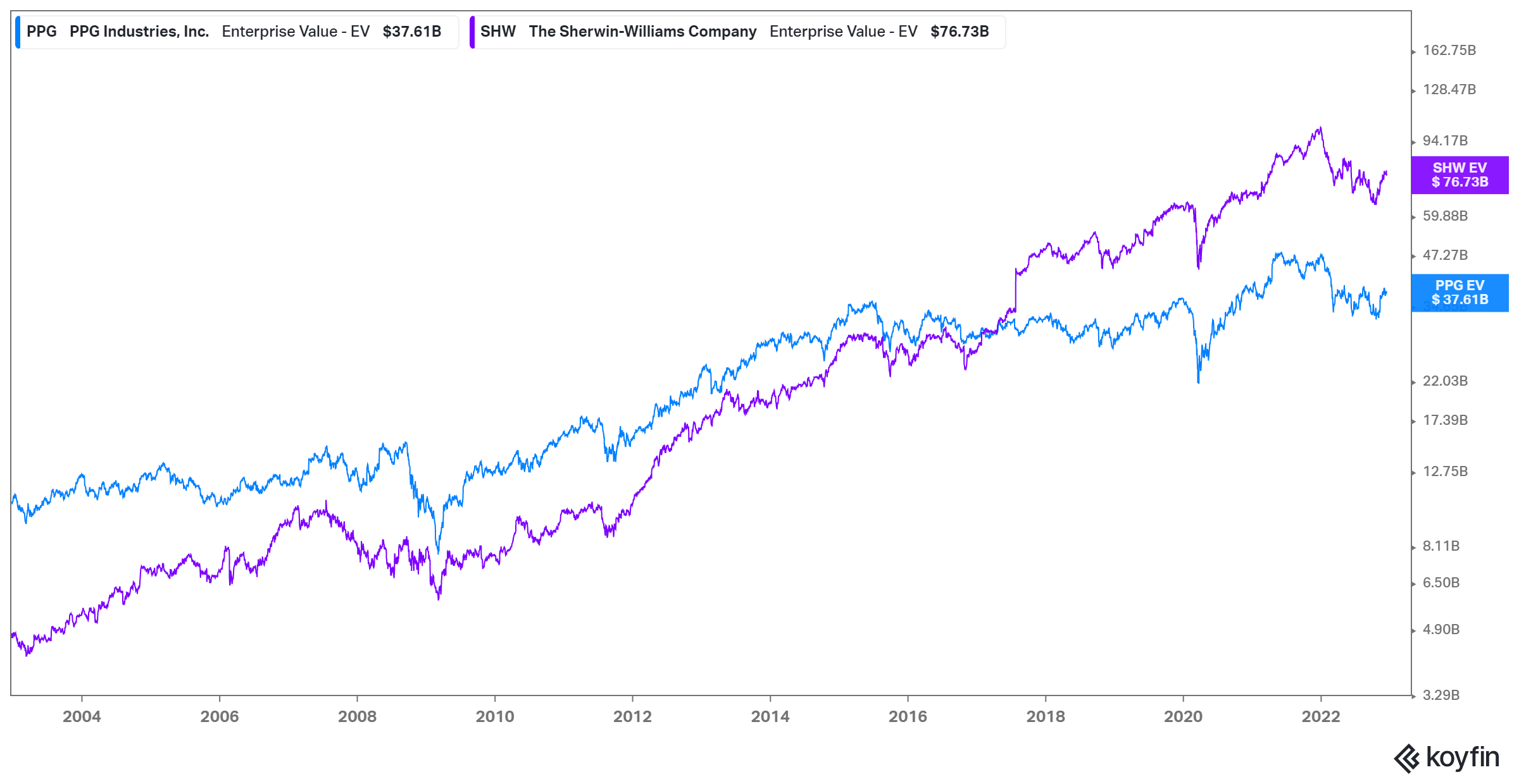 From 2002-2017, PPG used to have higher Enterprise Value (EV) than Sherwin Williams. Today, Sherwin Williams has almost twice the EV of PPG. In fact, in 2002, their position was completely reversed as PPG had $10 Bn EV vs SHW's $5 Bn.