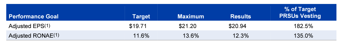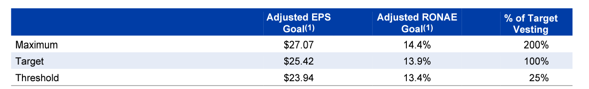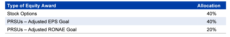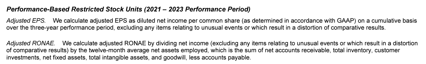 Long-term (3-year) incentives are paid via options (40%) and the rest is Performance RSUs which are related with two metrics: cumulative EPS over 3-year period, and Return on Net Assets Employed (RONAE). Net Assets Employed includes all goodwill and intangibles which may be a good check and balance to ensure management doesn't go for ambitious acquisition spree.