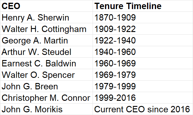 If you haven't studied Sherwin Williams yet and I asked you how many CEOs Sherwin Williams had in the last 156 years since its inception in 1866, I bet you wouldn't guess the answer would be fewer than 10. Indeed, the correct answer is just 9. You can probably praise and admire one or two CEOs for their long service to Sherwin Williams, but what do you do when everyone does this job for 10-20 years?